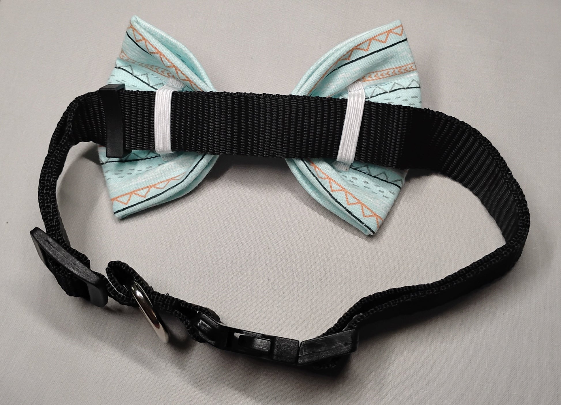 Our bow ties are safe, easy to use, made to last and 100% individually handmade. Simply take off your dog's collar, slide the collar through the elastic bands on the back of the bow tie and put the collar back on your pet...and BAM! Added cuteness! Our bow ties are made so they stay on the collar and can't be shaken off or removed in any way by your pet. Thus, ensuring that your pet can't take it off and chew it up when you're not looking. Our bow ties are specially made to stay thick and not flatten over time and to hold their shape well even through washings. I offer four sizes, and you can go up or down on the size based on your preferences (I recommend not going up or down by more than one size due to elastic sizes on bows).