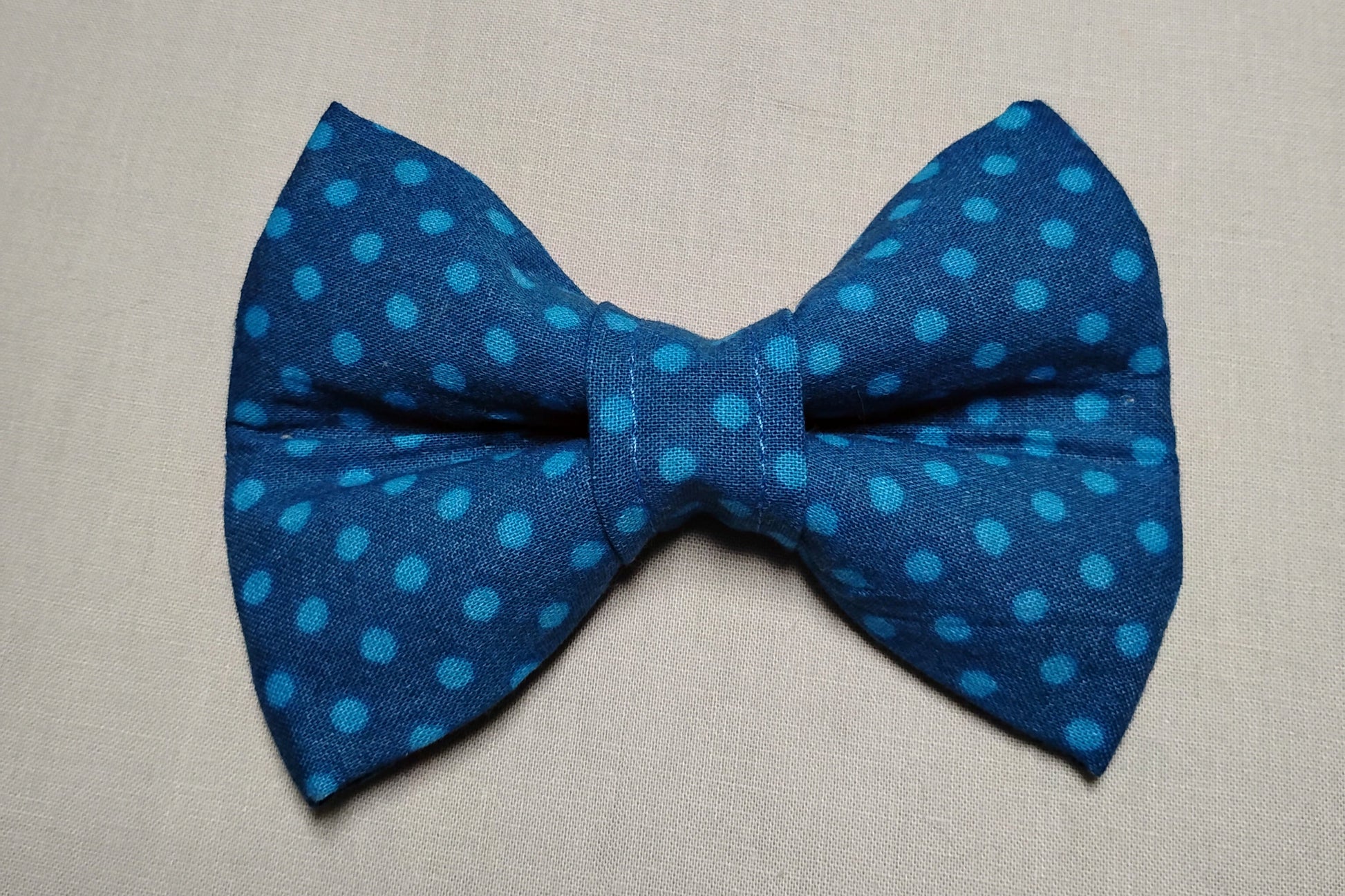 Our bow ties are safe, easy to use, made to last and 100% individually handmade. Simply take off your dog's collar, slide the collar through the elastic bands on the back of the bow tie and put the collar back on your pet...and BAM! Added cuteness! Our bow ties are made so they stay on the collar and can't be shaken off or removed in any way by your pet. Thus, ensuring that your pet can't take it off and chew it up when you're not looking. Our bow ties are specially made to stay thick and not flatten over time and to hold their shape well even through washings. I offer four sizes, and you can go up or down on the size based on your preferences (I recommend not going up or down by more than one size due to elastic sizes on bows).