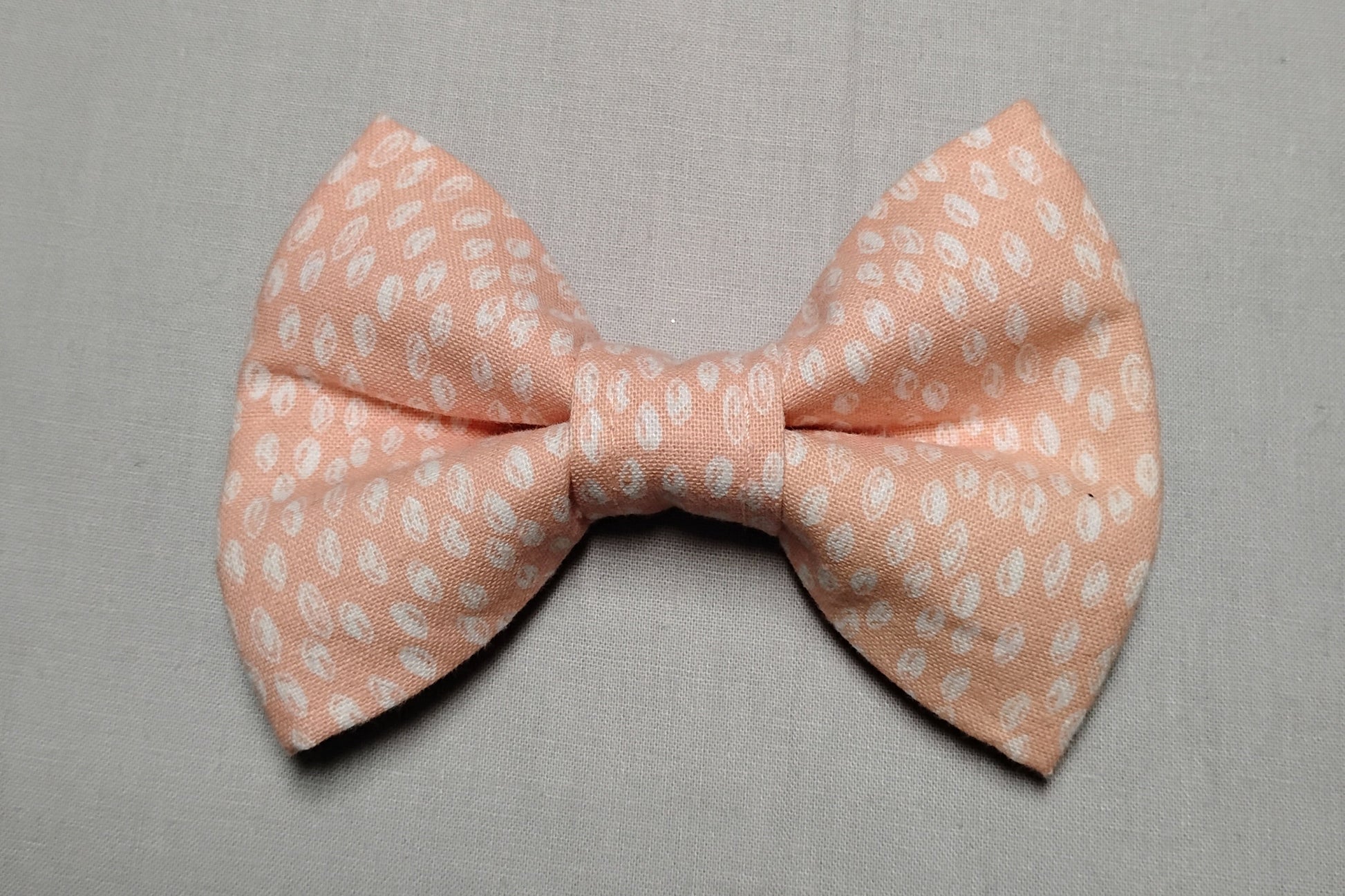 Our bow ties are safe, easy to use, made to last and 100% individually handmade. Simply take off your dog's collar, slide the collar through the elastic bands on the back of the bow tie and put the collar back on your pet...and BAM! Added cuteness! Our bow ties are made so they stay on the collar and can't be shaken off or removed in any way by your pet. Thus, ensuring that your pet can't take it off and chew it up when you're not looking. Our bow ties are specially made to stay thick and not flatten over time and to hold their shape well even through washings. I offer four sizes, and you can go up or down on the size based on your preferences (I recommend not going up or down by more than one size due to elastic sizes on bows).