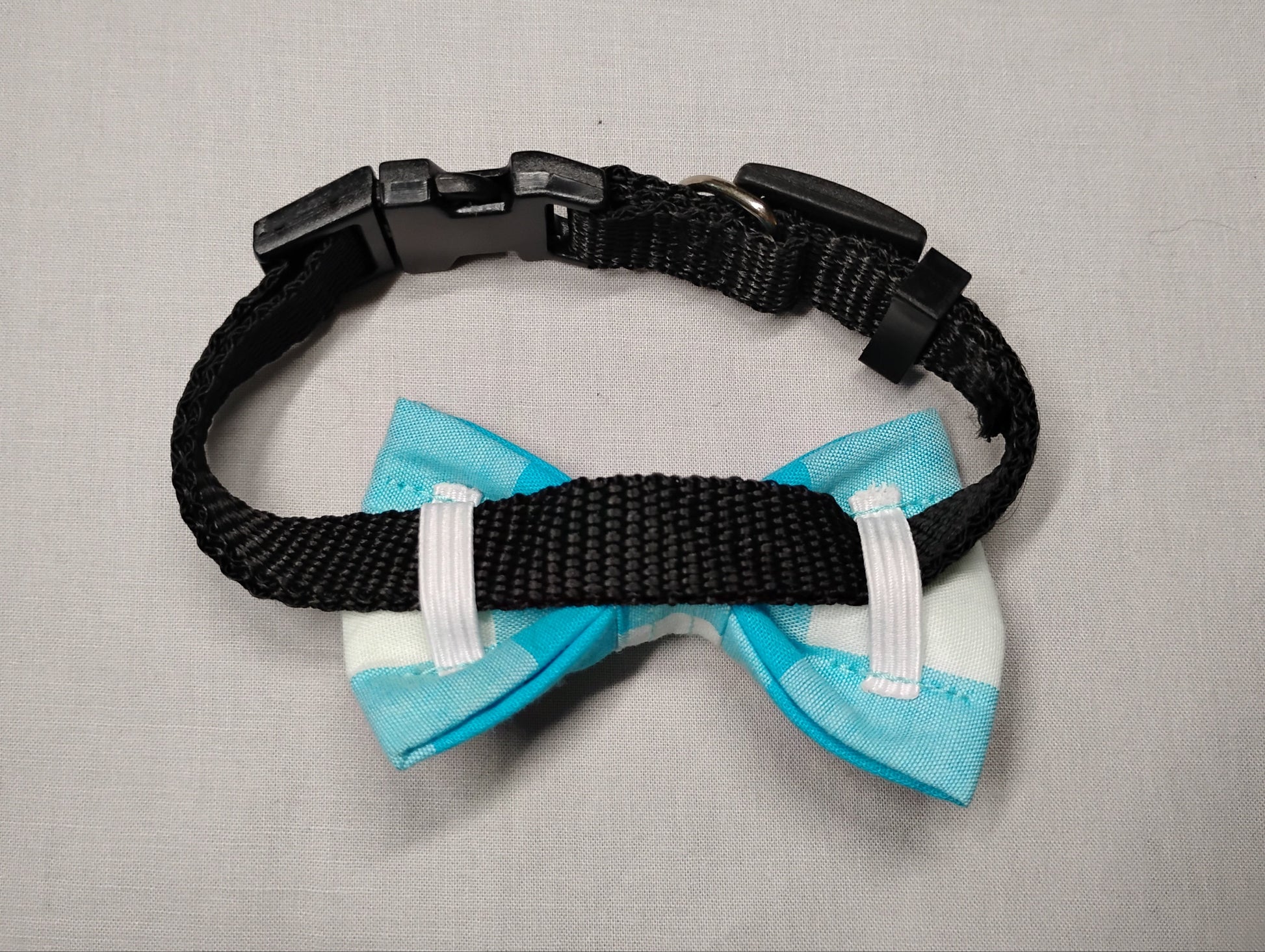 Our bow ties are safe, easy to use, made to last and 100% individually handmade. Simply take off your dog's collar, slide the collar through the elastic bands on the back of the bow tie and put the collar back on your pet...and BAM! Added cuteness! Our bow ties are made so they stay on the collar and can't be shaken off or removed in any way by your pet. Thus, ensuring that your pet can't take it off and chew it up when you're not looking. Our bow ties are specially made to stay thick and not flatten over time and to hold their shape well even through washings. I offer four sizes, and you can go up or down on the size based on your preferences (I recommend not going up or down by more than one size due to elastic sizes on bows).